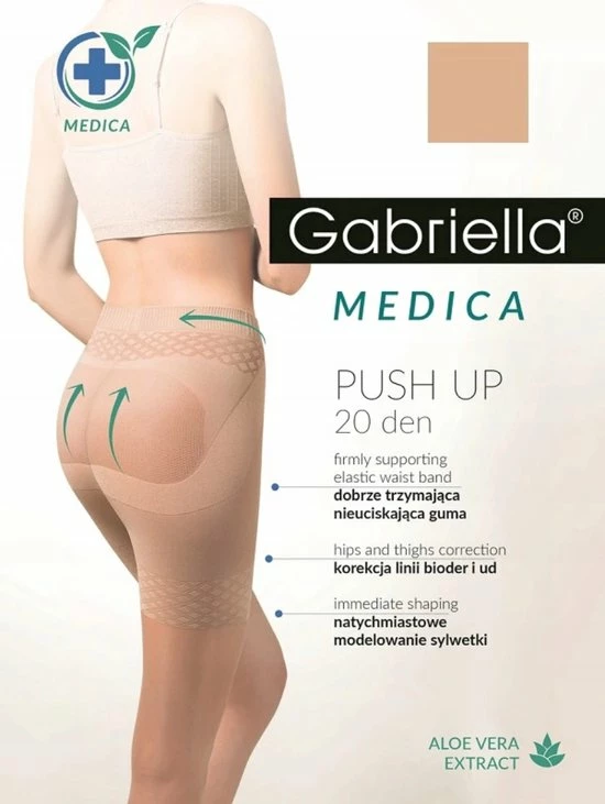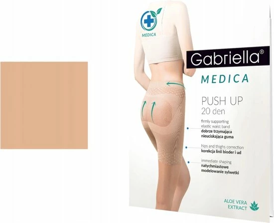 Push-up panty’s? Het is mogelijk! Een gespecialiseerd product dat veel delen van het lichaam positief beïnvloedt – dit zijn functionele Gabriella Push Up-panty’s en -leggings. Deze modellen passen zich perfect aan bij de lijnen van de heupen, buik en dijen, waardoor de vorm van het figuur wordt verbeterd en onmiddellijk wordt gevormd. Dankzij het gebruik van een drukvrije boord en een speciaal broekgedeelte, zijn de producten comfortabel, terwijl ze de problematische delen van het lichaam effectief ondersteunen en de billen liften. Comfort wordt ook geboden door innovatieve verzachting met aloë-extract, dat zorgt voor comfort tegen de huid. De producten zijn verkrijgbaar in vele kleuren en diktes.