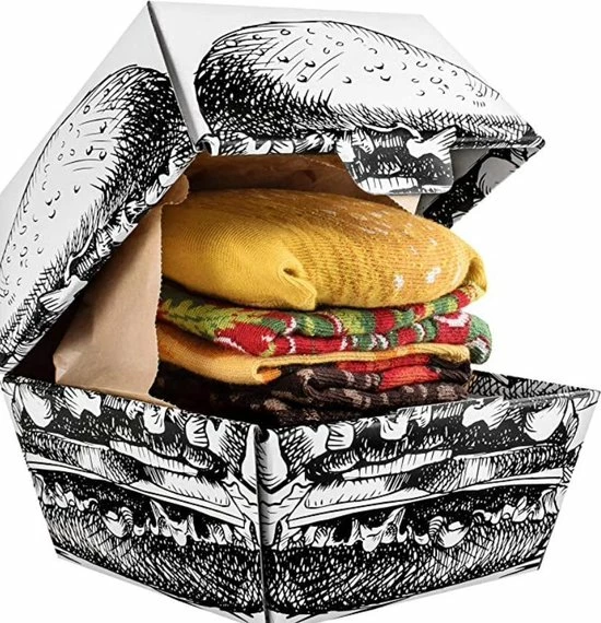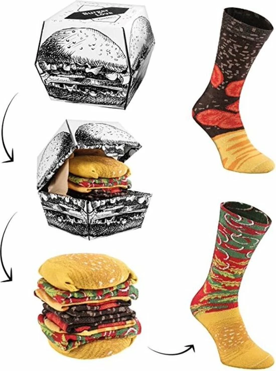 Verrassing cadeau! – Heeft u een vriend die van hamburgers houdt? Kan uw partner of familielid zich geen week voorstellen zonder deze lekkernij? Verras ze en geef ze een hamburgersok. De verpakking onthult niet de echte inhoud, dus je hamburgermop zorgt voor veel gelach en plezier. Naast de wow-factor krijgt de ontvanger 2 paar bijzondere sokken.