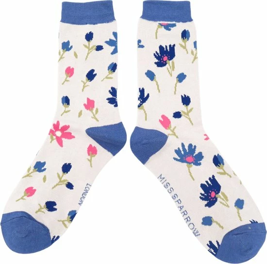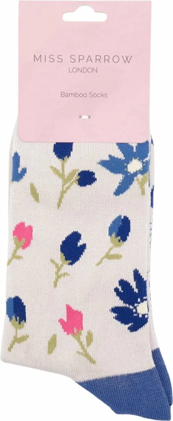 Mooie fleurige bamboe damessokken met bloemenprint in de kleur silver Deze vrolijke zachte sokken zijn van het Engelse merk Miss Sparrow en zijn gemaakt van bamboe. Ga jij ook voor deze leuke bloemenprint?