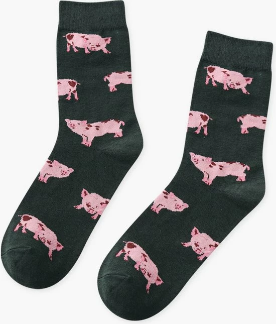 Katoenen sokken met varkens. De achtergrond is antraciet, de varkens zijn roze gekleurd