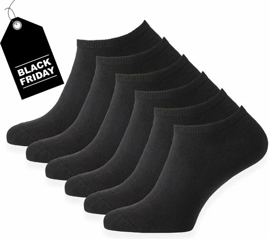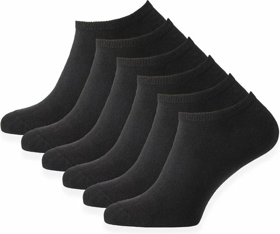Deze set bestaat uit zes paar zwarte enkelsokken, gemaakt van katoen en elasthaan.