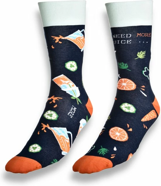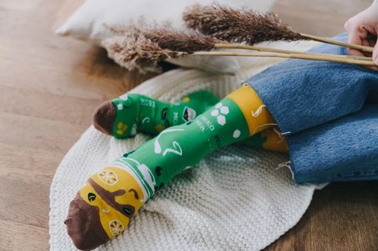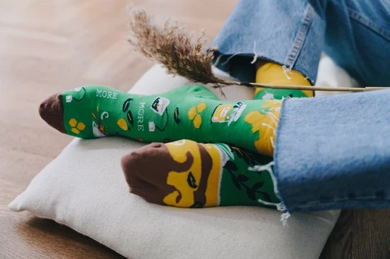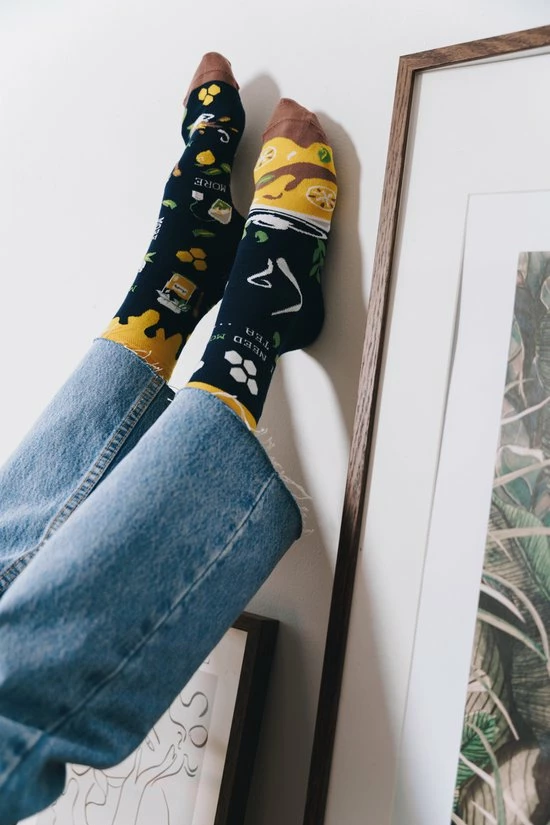 De sokken hebben een asymmetrische print, wat met andere woorden betekent dat de linker sok anders is dan de rechter, maar ze passen net zo goed bij elkaar als een glas thee tot honing en fruitsap tot een rietje.