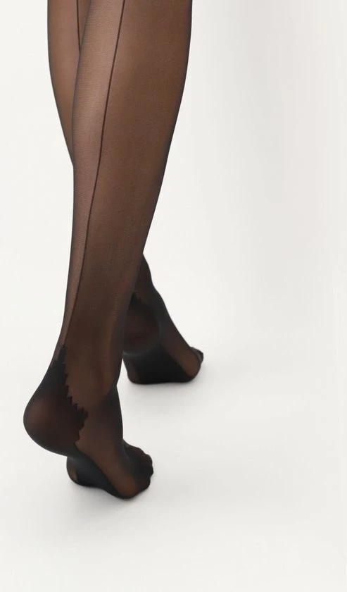 20 denier transparante stay-up kous met een subtiele satijnglans en een glanzende boord. Deze boord is aan de binnenzijde voorzien van meerdere siliconen strips, waardoor de kous perfect blijft zitten. De kous heeft een naad achterop het been met een klassieke, piramidevormige hiel. Een zeer vrouwelijke kous waarmee je op iedere party de show steelt!