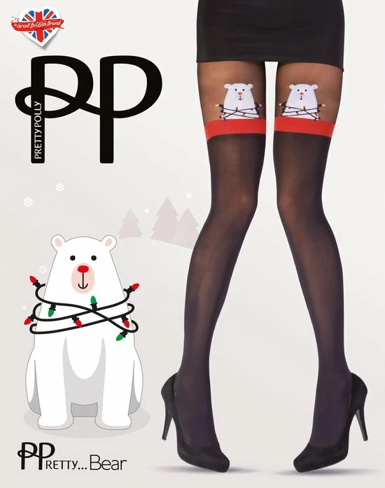 De PPretty Bear Tights van Pretty Polly is de perfecte panty voor de feestdagen! Deze prachtige panty heeft een mooie over the knee look met net boven de knie een ijsbeer met kerstverlichting. De panty is zowel met een korter als met een langer rokje uitstekend te combineren. Maak je Christmas outfit compleet met deze leuke Snowbear Tights!