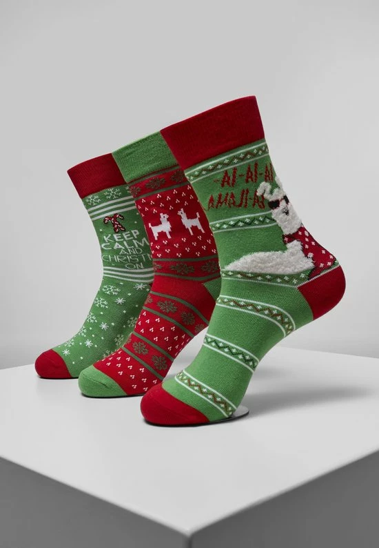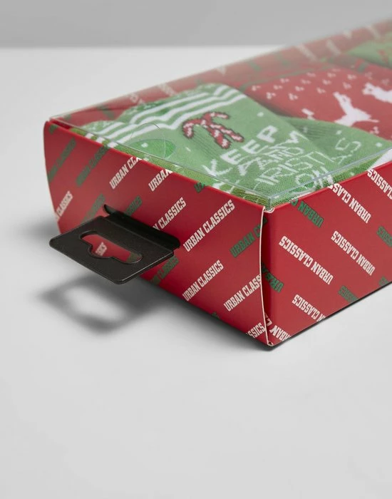Deze vrolijke Urban Classics sokken steken ver boven de enkel uit en bieden de ouderwetse kerstsfeer. Het ontwerp slaat op het opschrift “Keep Calm and Christmas on”. Het wordt verrijkt met sneeuwvlokmotieven en een veelvoud aan kleuren in groen, wit en rood. De gebruikte kleuren benadrukken de elastische manchetten en de teen- en hielgebieden van de sokken. De kousen zijn gemaakt van katoen en polyester met een klein percentage elastaan en garanderen hierdoor een uitstekend draagcomfort. Ze hebben de gunfactor van de drager door zichzelf te presenteren in een praktisch pakket van drie paar. Welke kerstdag, welke sokken?